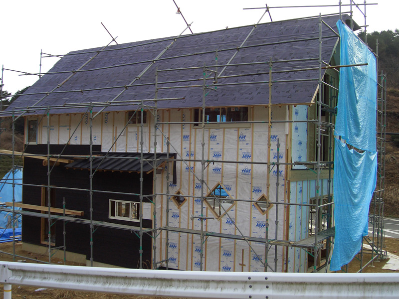 ところが、途中で大雪に降られた。しかも、日中の最高気温が上がらないため、積もった雪がなかなか溶けてくれない。屋根勾配はとても急で、かんたんな屋根足場をしているものの片手は足場を掴んでいないと屋根におれない。左手で足場を握り、右手にスコップでシャーベット状になった雪を砕いて板を貼った。ルーフィングは下で長さにカットして、どうにかして一人で貼れた。霜が降りたルーフィングが氷のようにツルツルになり、どうあがいても足が滑る恐怖を思い出す。